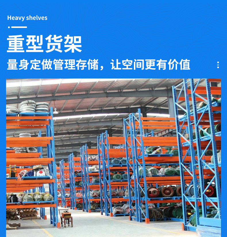 重型货架的层高可调,配以各种型号叉车和堆垛机,重型仓储货架能实现各种托盘的快捷存取,单元货格最大可达 2000KG ,是各行业最常用的存储方式。每一块托盘均能单独存入或移动而不需要移动其他托盘。能适应各种类型的货架。重型仓储货架能按货物尺寸的要求,调整横梁的高度。货物流通量大,装卸迅速。配套设备最简单,成本也最低,能快速安装及折装。